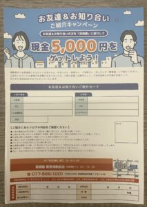 ご紹介いただいたお客様のお部屋が決まりましたら、引越しお祝い金として現金5000円をプレゼントいたします㊗️✨🎁